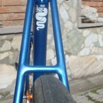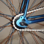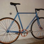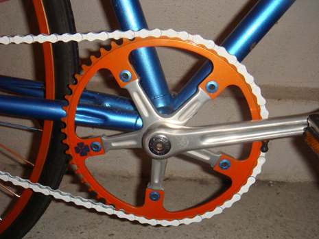 -Zadnji točak je upleten klasično, jer trpi mnogo veća opterećenja (prilikom slajda). Ram je dobio „Shimano“ monoblok. Zanimljivo je da ovaj ram ima kontra navoj, tj. da se desna strana zavija u desno, a ne obrnuto. No, dužina 110mm, i rezultat je da nosač šabnje prolazi na jedan milimetar. Glava zadnjeg točka je pribijena uz desnu stranu rama, da bi bila u pravcu prednjeg lančanika. Zadnja glava je na navoj, pa sam zadnji lančanik napravio da bude fiksan. Iskoristio sam lančanik od jednobrzinke koji sam zavario. Sve je to obrađeno i ofarbano. Prvo vreme sam vozio prenos 52-16. Prenos mi je odgovarao, ali mi je pravio problema prilikom starta, tj. bilo mi je naporno dok krenem. Sada vozim 52-18 prenos i rešio sam problem sa startom. Izgubio sam malo na top speed-u :) ali to je zanemarljivo.